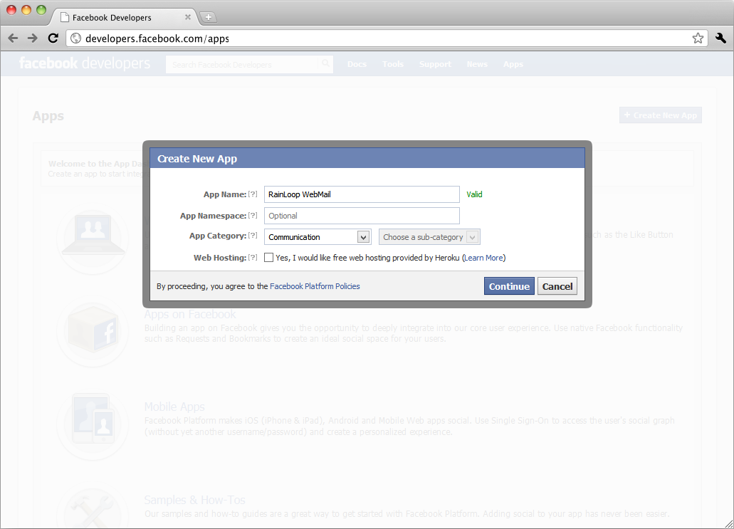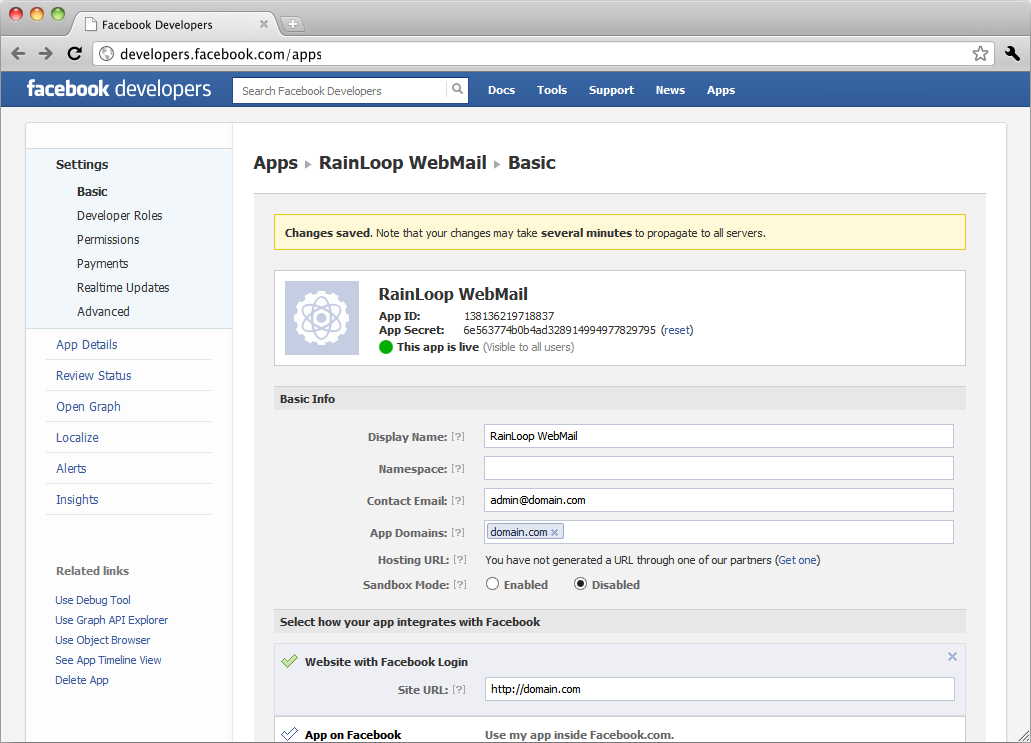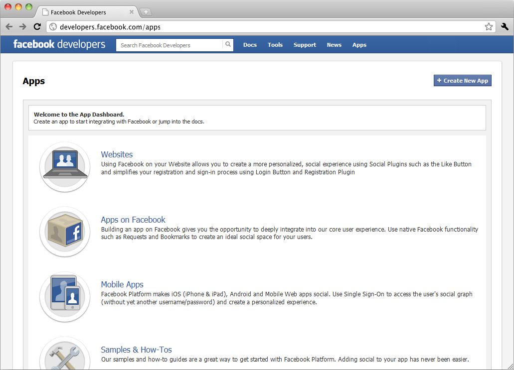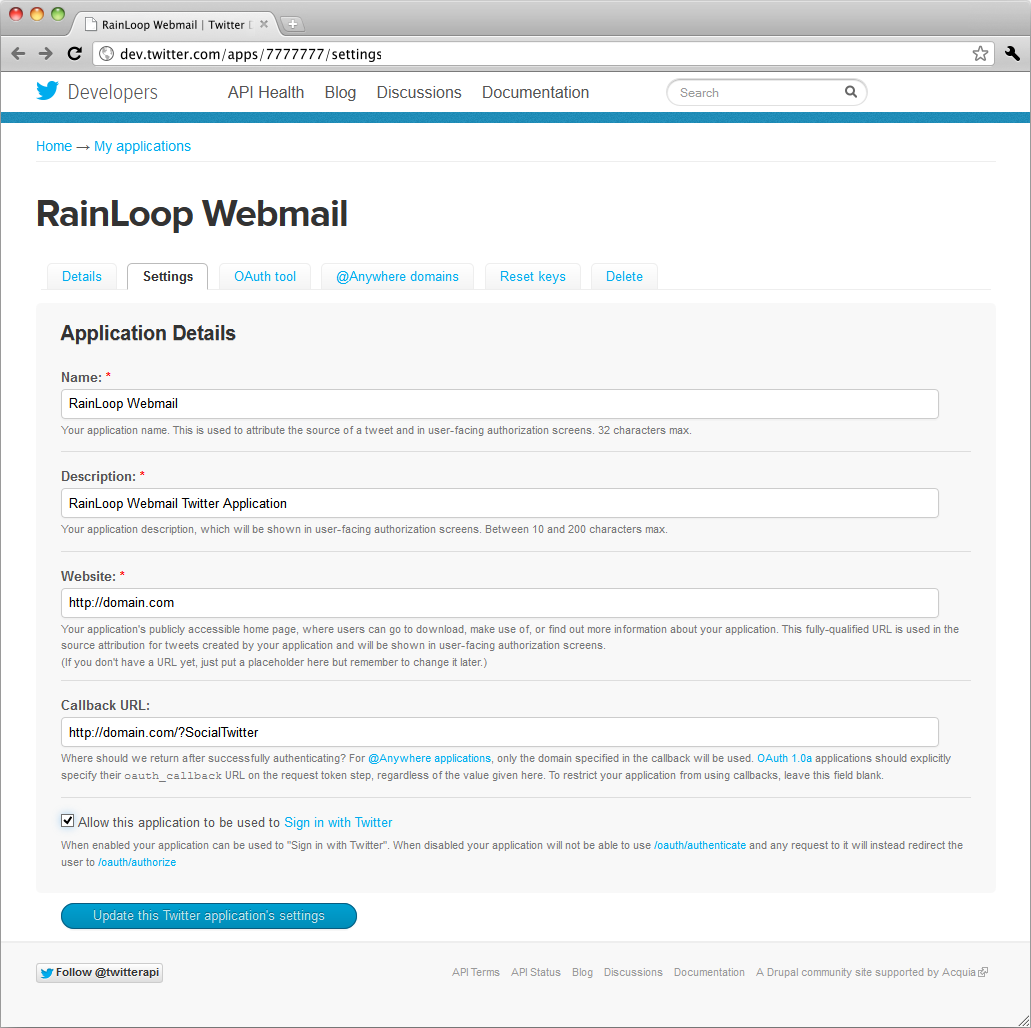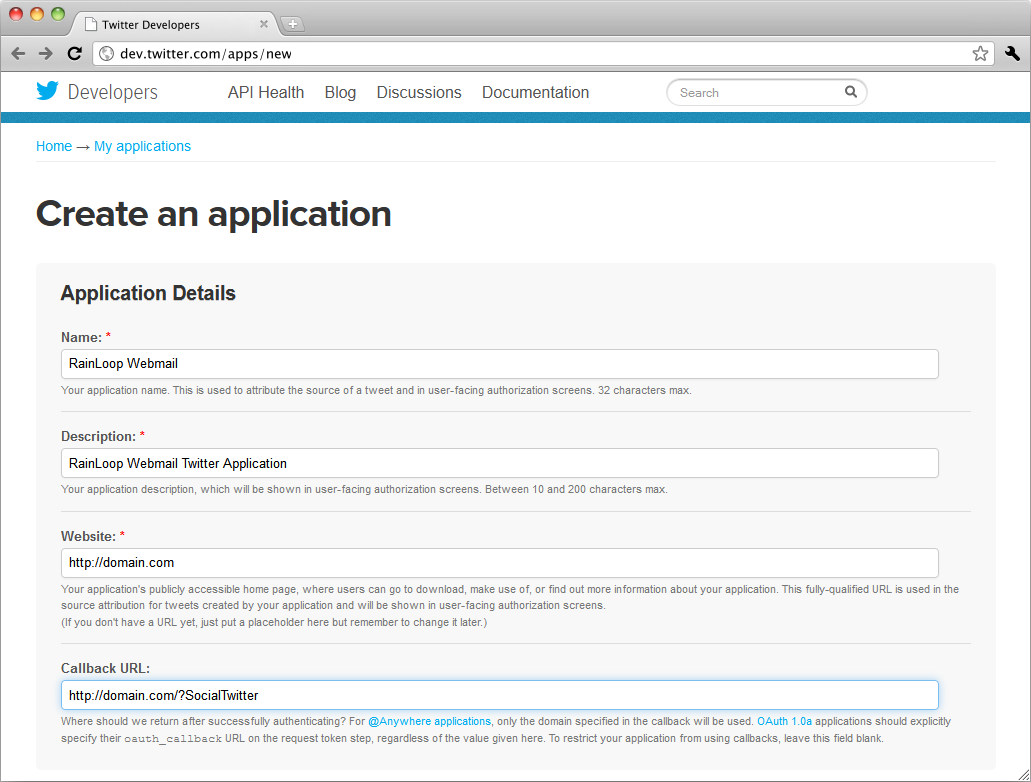 like Navigate to Facebook App Dashboard page and register new application there. Upon registration, you'll get App ID and App secret values, you'll need to supply those in admin panel. Navigate to https://dev.twitter.com/apps page and register new application there. Upon registration, you'll get Consumer Key and Consumer Secret values, you'll need to supply those in admin panel.