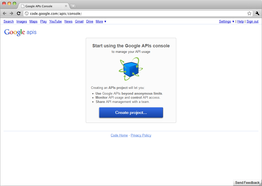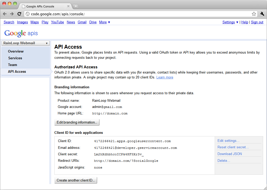 Integration with Facebook, Google and Twitter allows to log users in with their social network credentials, with no need. Dropbox integration allows for attaching files from your Dropbox storage. To start using the integration, switch to Integrations tab of admin panel, and appropriate fields for specific social networks should be filled there. Each social network requires setting up integration application to allow access to user's data. Alternately, existing integration application can be used. Navigate to APIs Console page and register new application there. Upon registration, you'll get Client ID and Client secret values, you'll need to supply those in admin panel.