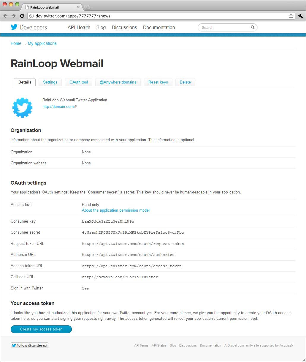 Note that Redirect URIs field is supplied with the value